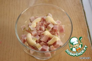 Итак, первый слой - мелко нарезанная ветчина (можно взять обычную вареную колбаску) и немного капнуть майонезом -