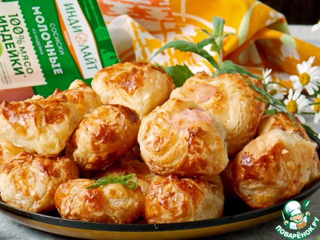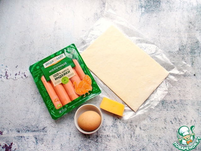 Стол немного посыпьте мукой и раскатайте слоеное тесто, разрежьте на квадратики. Сосиски из индейки "Индилайт" очистите от оболочки и нарежьте на кружочки толщиной 1 сантиметр и разложите на серединку каждого квадратика.