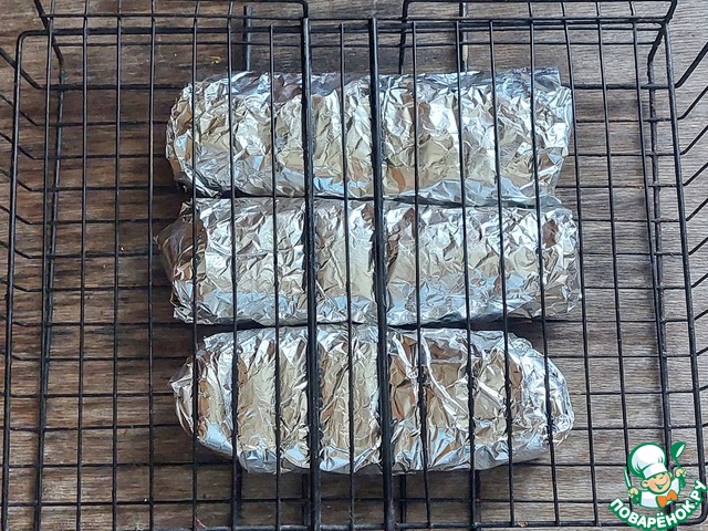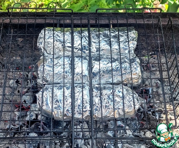Готовить на углях, периодически переворачивая, 25-30 мин. Можно приготовить в духовке, заранее разогретой до 200 гр.