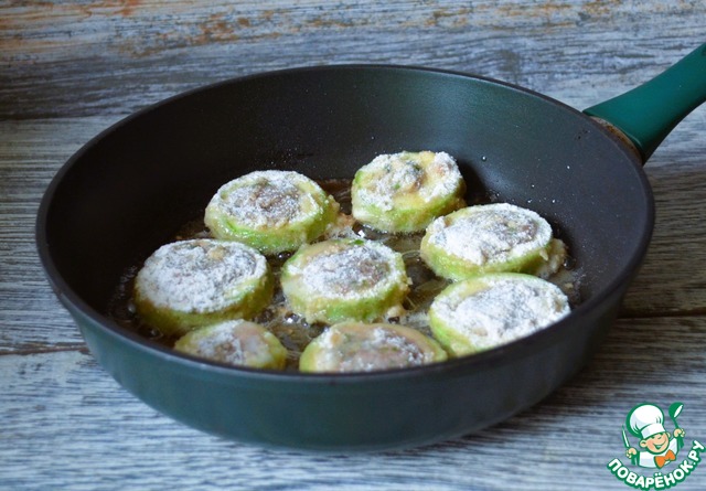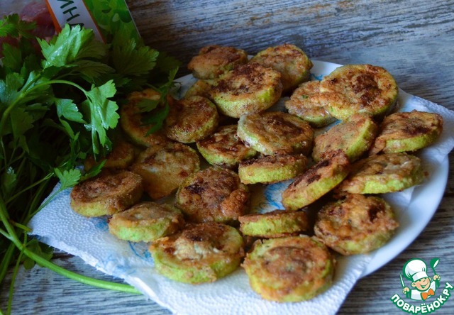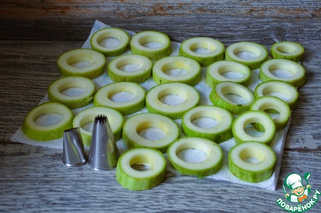 Кабачки вымыть, нарезать тонкими колечками. Мякоть удалить, разложить кольца на бумажном полотенце.