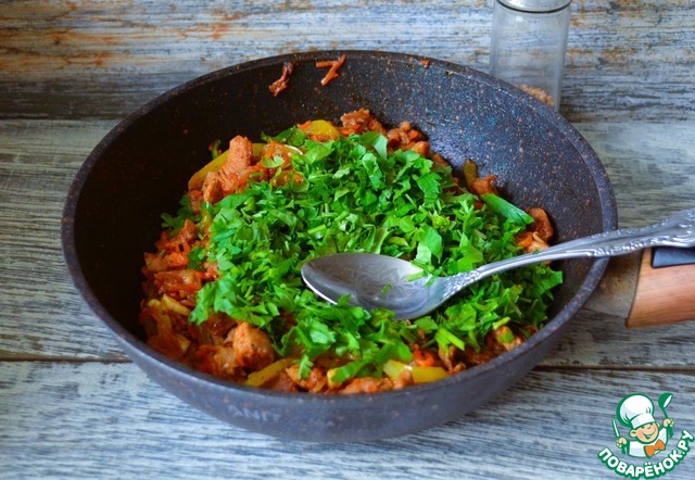 Добавить соль, сахар, специи. Жарить 3 минуты, перемешивая.