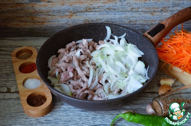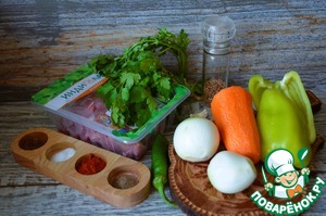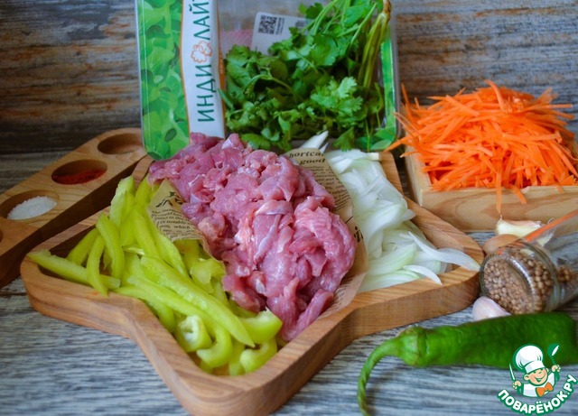 Индейку зачистить от сухожилий, нарезать тонкими полосками. Лук и сладкий перец нарезать полосками. Морковь натереть на спец. тёрке или нарезать соломкой.