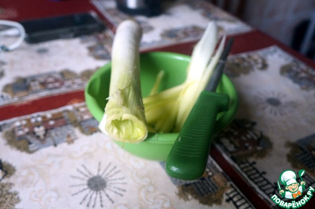 От стебля порея отрезать зеленую часть с листьями – их можно использовать для бульона или для приготовления букета гарни.