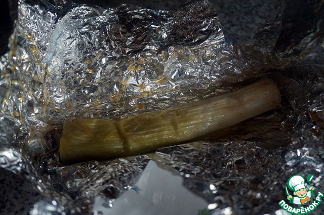 Смазать стебель растительным маслом, завернуть в фольгу – я на всякий случай завернул в два слоя.
