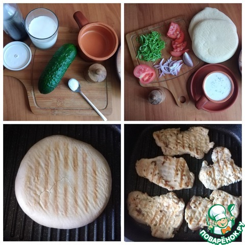 Готовим соус. Натуральный йогурт соединяем с натёртым огурцом, сахаром и солью, добавим уксус винный или яблочный. Соус пробуем на вкус и если что, то корректируем по себе (соль, сахар, уксус). Овощи нарезаем произвольно, чтобы смогли их поместить в "кармашек" питы. Питы подсушим с обеих сторон на сковороде-гриль. Потом на ней же обжарим кусочки филе индейки, немного их отбив. Это быстро.