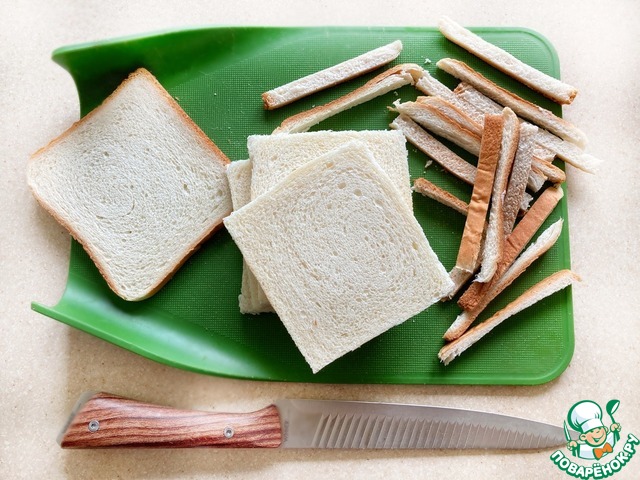 У хлебных ломтиков срежьте края. "Краюшки" я подсушила, измельчила и далее использовала в качестве панировочных сухарей.