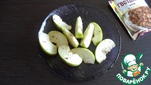 Яблоки нарезать ломтиками, посыпать измельченной гвоздикой, щепоткой сахара и перца. Поставить в холодильник на 10 минут.