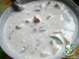 Готовлю соус из сметаны, перца стручкового (мелко нарезанного), черного перца, сыра (мелко нарезанного) и добавляю немного воды, чтоб соус мог медленно сливаться с ложки