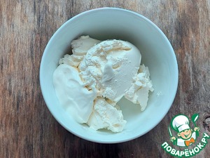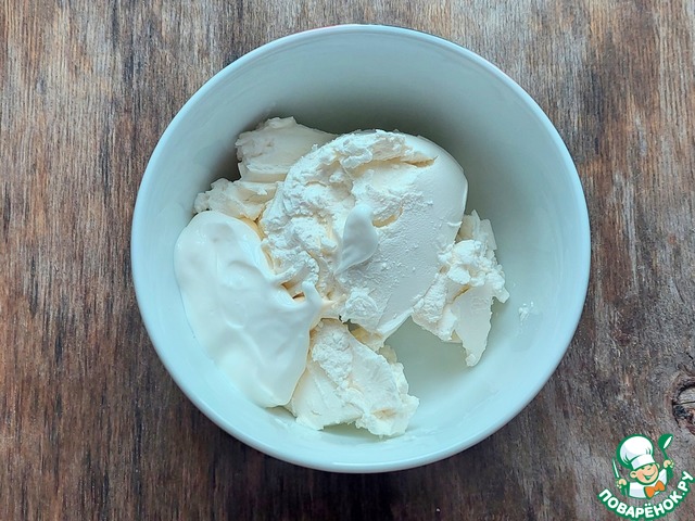 За 30 мин. до начала приготовления рулета, вынуть из холодильника творожный сыр. Соединить творожный сыр со сметаной или майонезом, хорошо перемешать.