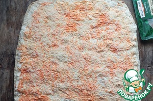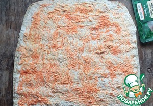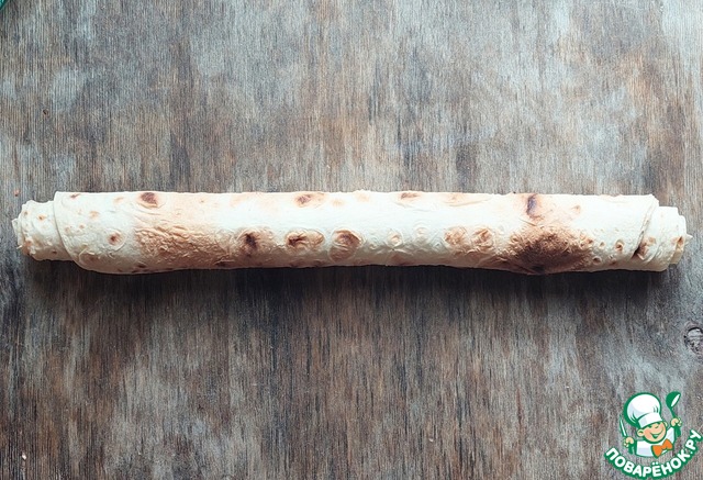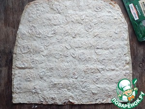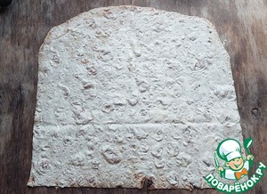 У меня был большой армянский лаваш, который я разрезала пополам. Одну половинку лаваша смазать 1/3 творожной начинки.