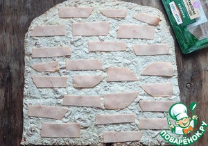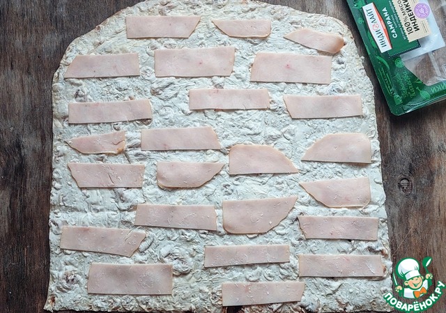 Нарезать ветчину произвольно, распределить поверх лаваша.
