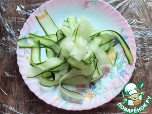 Огурец помыть, нарезать с помощью овощечистки на тонкие полосочки (середину с семенами не использовать).