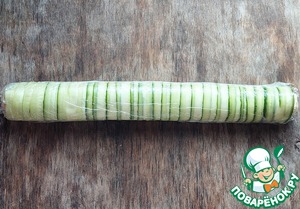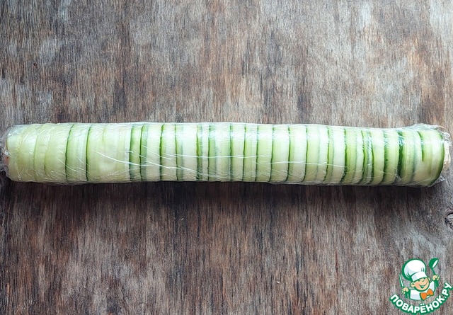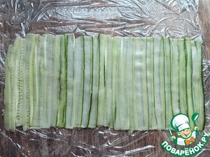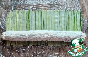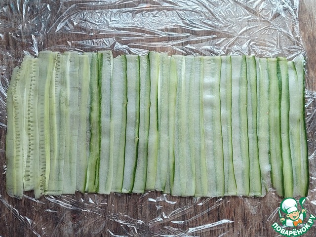 Рабочую поверхность застелить пищевой плёнкой. Распределить в ряд полоски огурцов, внахлест друг на друга.