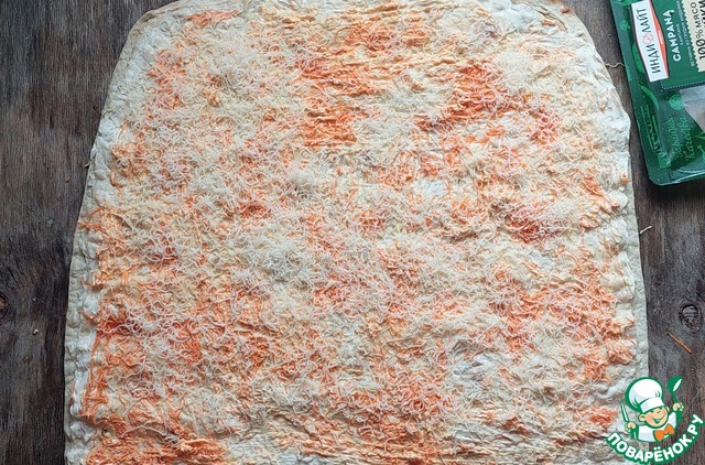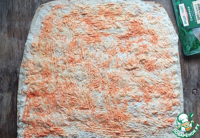 Морковь почистить, помыть, натереть на мелкой тёрке. Распределить поверх лаваша.