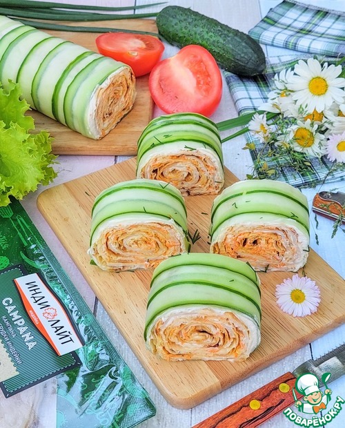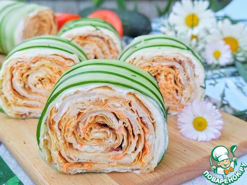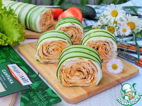 Закуски из лаваша – это универсальное блюдо, которое отлично подходит для пикников и посиделок на природе. Ведь очень удобно брать с собой что-то, чем можно перекусить, пока готовится шашлычок. Сегодня я предлагаю вариант лаваша с ветчиной, морковью и сыром. А так же с огурцом, который сделает наш рулет не совсем обычным, красивым и аппетитным. Угощайтесь!