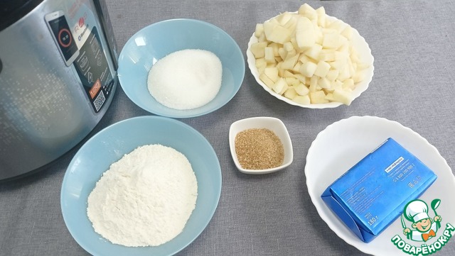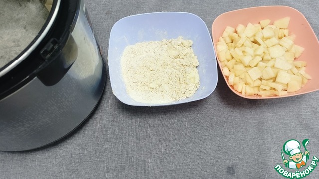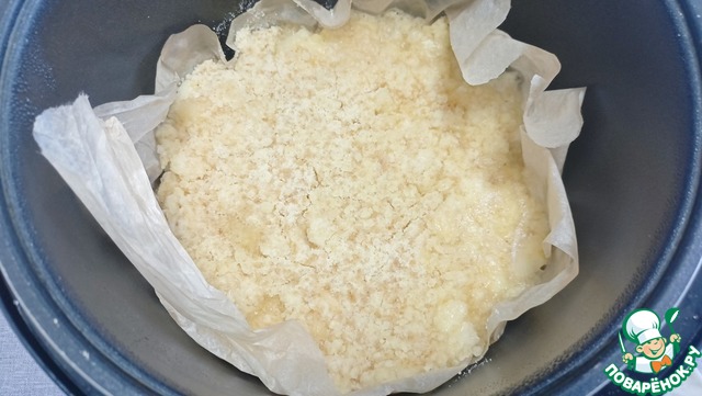Дно чаши устилаем бумагой для запекания. Сначала отправляем яблаками, а потом сверху наше "тесто". Всё тщательно выравниваем — Режим «Выпечка» (t-150C) 35 минут.