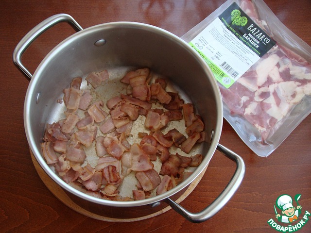 В первую очередь, в небольшом количестве растительного масла, обжарьте бекон, нарезанный на средние ломтики. Переложите на блюдо. -