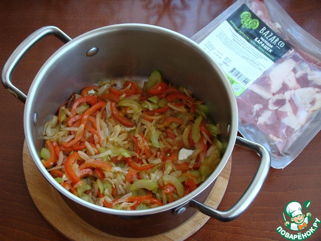 Так как все будем готовить в одной кастрюле ( казане), то все овощи и бекон, будем обжаривать по очереди.