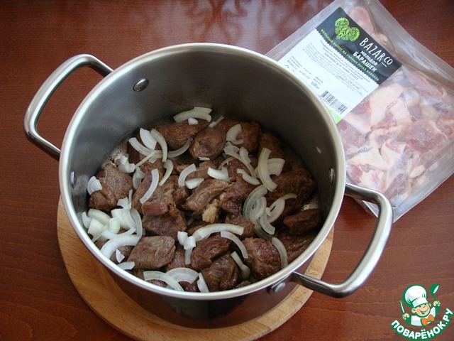 Следующая на очереди баранина. Обжарьте до румяного цвета, добавьте нашинкованную соломкой репчатую луковицу, залейте водой.
