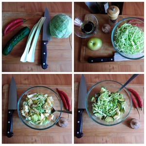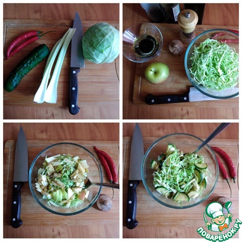 Пока обжариваются шашлычки, приготовим к ним салат из зелёных листьев молодой капусты. Листья нужно отделить от вилка, вырезать толстые прожилки, положить друг на друга и свернуть рулончиком. Тонко нарезаем капусту длинной лапшой. Огурец и сельдерей режем произвольно. Всё отправляем в салатник. Яблоко пока не режем. Делаем заправку. Соединим оливковое масло с соевым соусом и бальзамическим уксусом. Теперь нарезаем яблоко тоже произвольно, выкладываем сверху и сразу же поливаем заправкой. Перемешиваем и вот теперь солим и кладём сахар по вкусу. Можно в салат порезать перец-чили, но не все его едят. Поэтому его оставим до подачи и те, кто желает, будет его есть с шашлычками вприкус. Можете поперчить по желанию свежемолотым чёрным перцем.