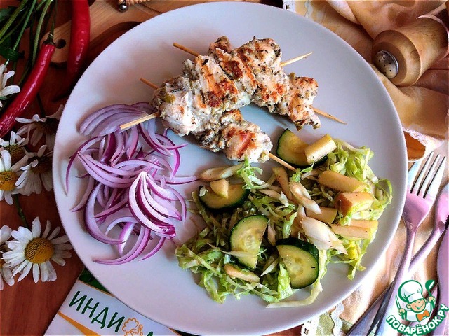 Оригинальные шашлычки для гриля или мангала. Кусочки индейки на деревянных шпажках, замаринованные в размолотых оливках с пряными травами и оливковом масле. Подадим такие шашлычки, приготовленные на гриль-сковороде, с зелёным капустным салатом и свежим крымским луком.