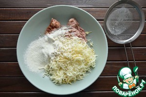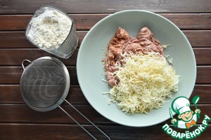 Колбаски освобождаю от оболочки и разминаю вилкой. Натираю на терке мягкий сыр.