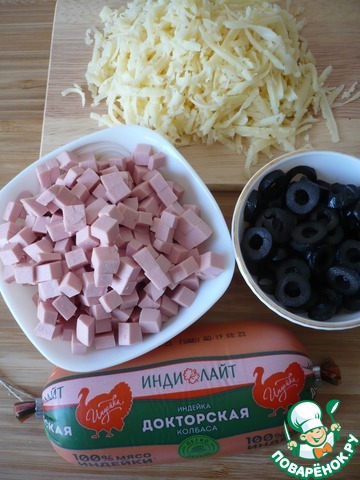 Твердый сыр натрите на средней терке, колбасу докторскую нарежьте кубиком, маслины нарезать кружочками.