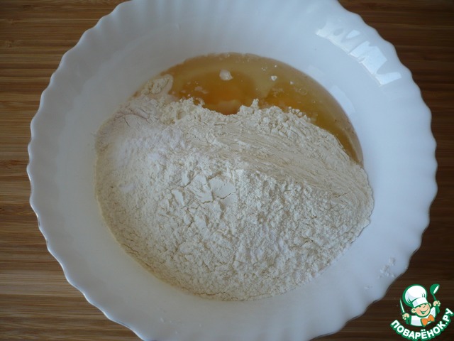В миску вбейте яйца, всыпьте пшеничную муку, разрыхлитель теста, влейте молоко и растительное масло.