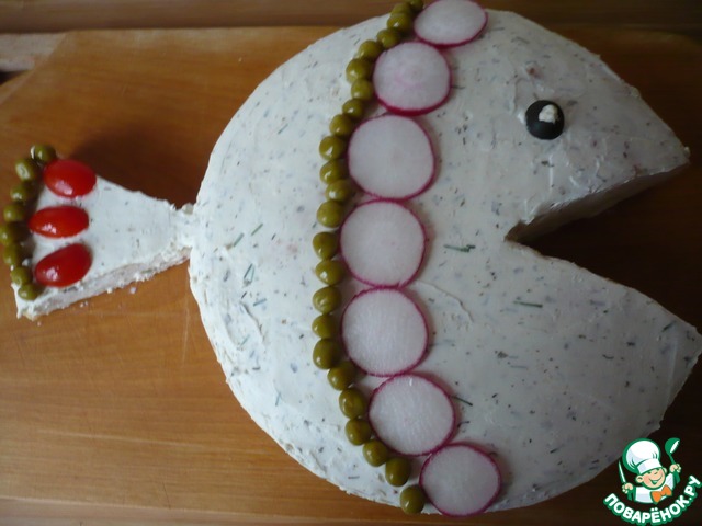 Нарежьте редис, помидор, огурец. Выложите редис и горошек в 2 ряда, разделив голову и туловище рыбы. Сформируйте 1 глазок из оставшейся черной маслины. В конце хвостика выложите 1 ряд горошка и 1 ряд помидор черри.