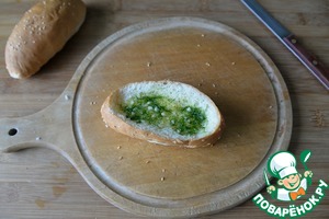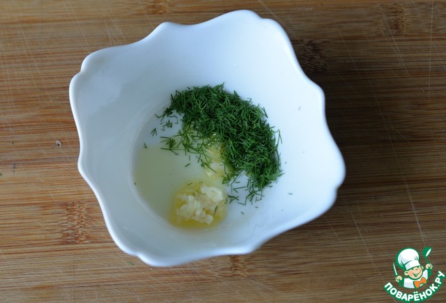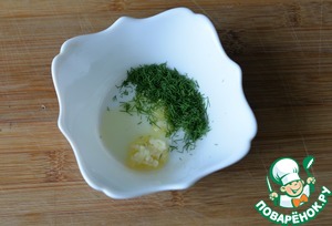 Готовим обмазку. Смешиваем оставшееся масло с рубленной зеленью, у меня - укроп. Выдавливаем чеснок, перемешиваем.