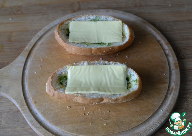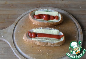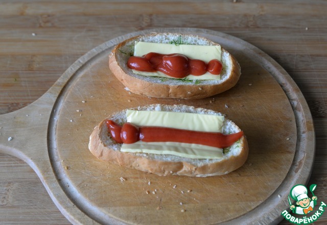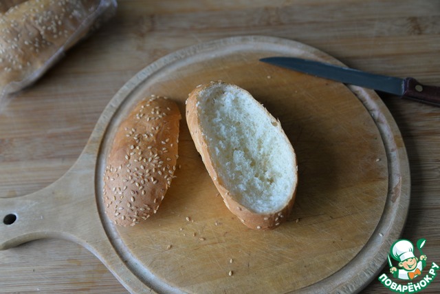Берём булочки для хот-догов по числу едоков. Можно взять также один багет. Аккуратно, острым ножом вырезаем середину булочки так, чтобы были бортики и получилась "лодочка". Слегка приминаем мякиш, чтобы было больше места для начинки.