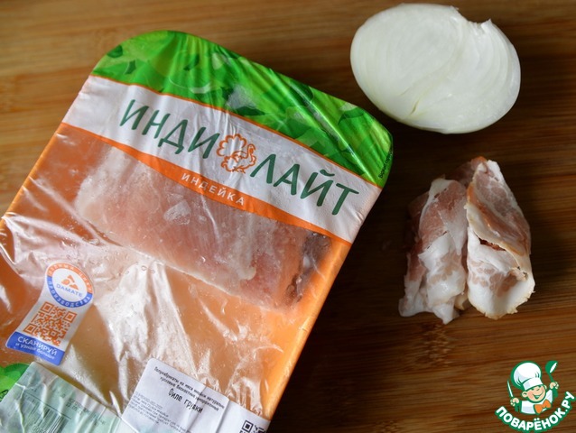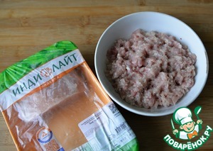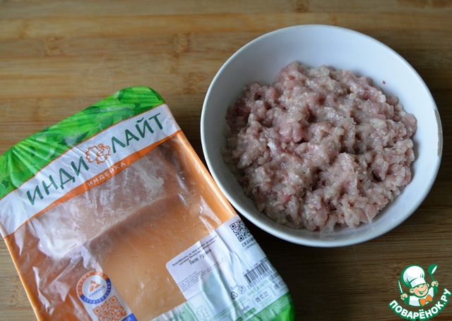 Для приготовления этой закуски берём филе индейки, которое нужно измельчить в фарш. У меня - филе грудки индейки "Индилайт". Филе перекручиваем с луком и беконом.