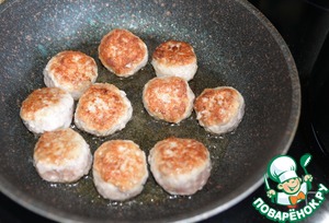 На горячую сковороду наливаем масло, кладём не плотно фрикадельки и обжариваем равномерно до румяности со всех сторон. Я готовила на среднем огне 10 минут.