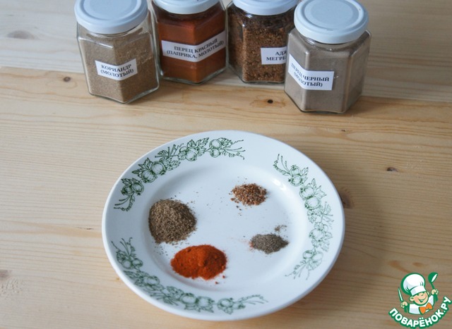 У меня 0,5 ч. л. молотого кориандра, 0,5 ч. л. паприки, аджика мегрельская 0,3 ч. л., молотый чёрный перец 0,3 ч. л.