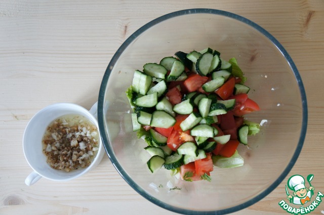 Сделайте заправку: горсть грецких орехов разотрите с зубчиком чеснока, добавьте лимонный сок, соль, перец, оливковое масло.