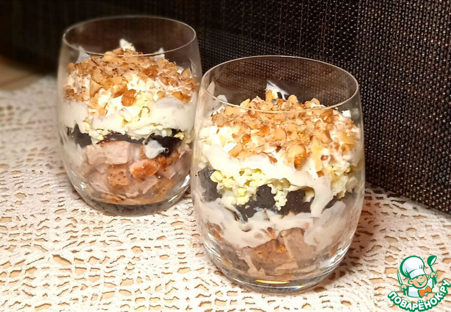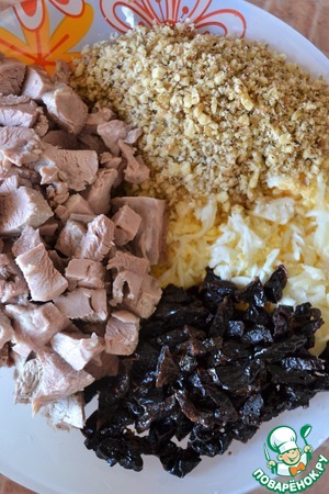 Чернослив перед приготовлением замочить в холодной воде на час. Нарезать. Остывшее мясо нарезать некрупными кубиками; натереть на тёрке отварные яйца; чеснок также натереть на тёрке.