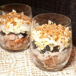 [+5]Готовила филе грудки индейки, обжаренную со специями (варёную не очень люблю, простовата для меня и бедра не было). К йогурту добавила чуть майонеза. Собрала слоями.