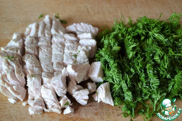 Отварную индейку нарезать кубиками. Укроп мелко нарезать. Смешать укроп, индейку и смесь перцев. Я использую перец чёрный, перец душистый и красный острый перец.