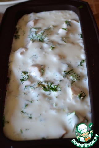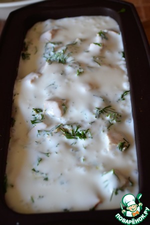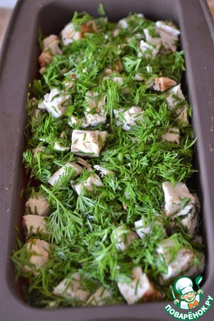 На схватившийся первый слой выложить смесь индейки и укропа.