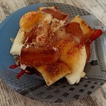 Выкладываем на тарелку сначала хлеб, а затем яйца с колбасой.