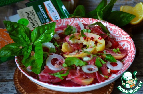 Украсить рубленым базиликом, розовым перцем, заправить оливковым маслом. Посолить розовой солью.