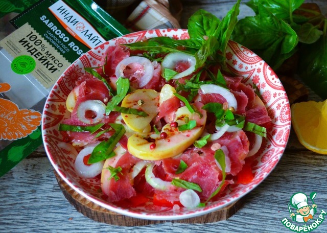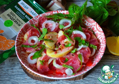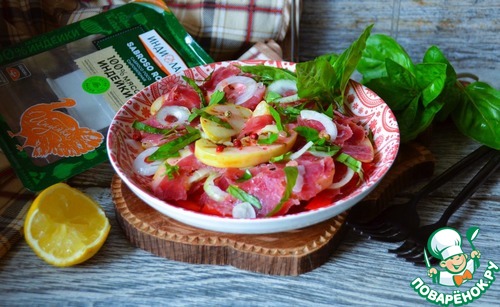 Лёгкий салатик, отлично впишется в атмосферу романтического пикника. Пока Ваш друг готовит бокалы и ищет штопор, можно быстро его приготовить. Рекомендую.