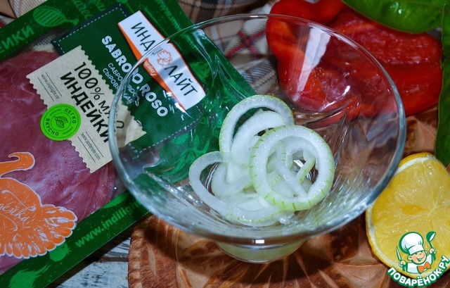 Лук ( 1/4 )нарезать кольцами и замариновать в лимонном соке.