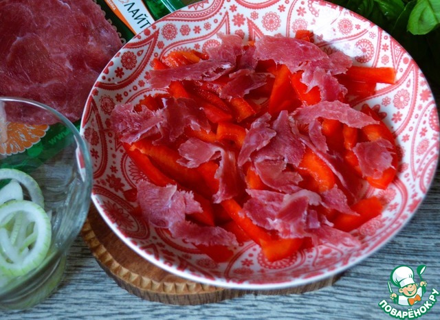 Перец нарезать соломкой, выложить в широкий салатник. На него нарвать руками половину колбасы.
