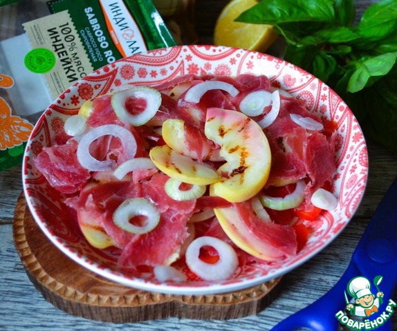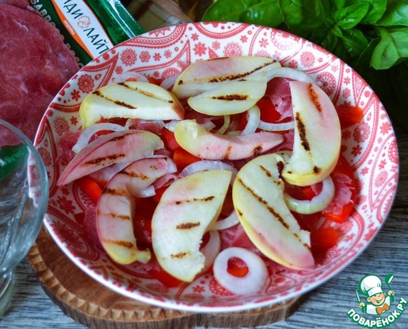 Добавить половину маринованного лука. Персик вымыть, нарезать и обжарить на гриль-сковороде, выложить сверху.