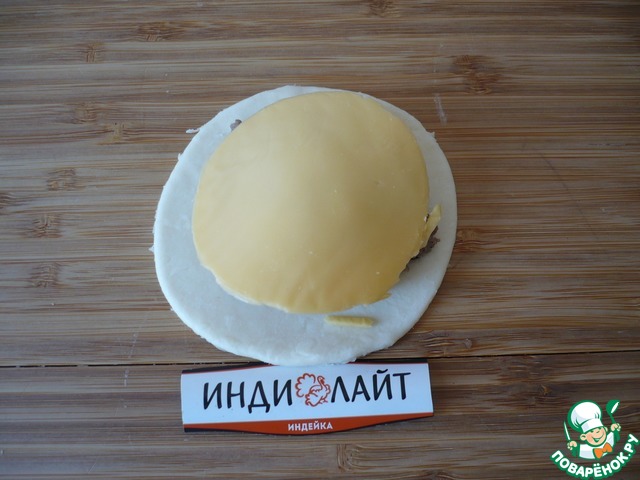 Положите ломтик плавленного сыра на фарш. Затем зажмите края теста и скатайте в шар.