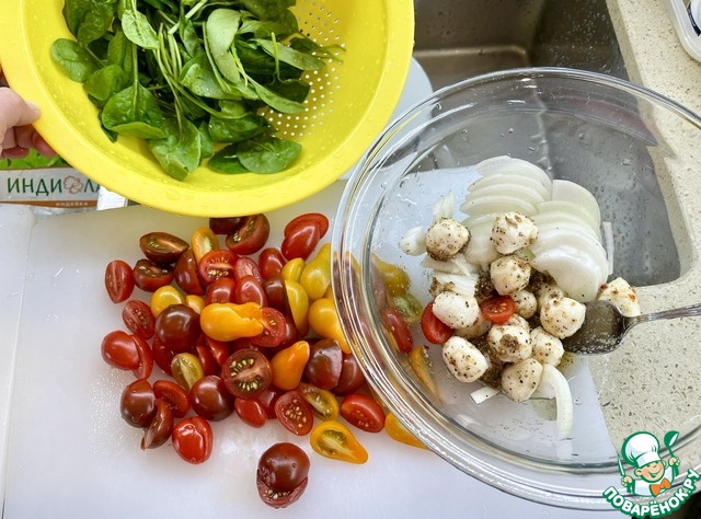 Добавляем лук, порезанные пополам помидоры черри и шпинат. Перемешиваем.