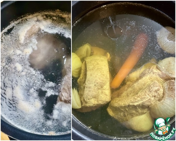 Вот и в этот раз…. Чтобы суп сварить - без бульона никак не обойтись. Заложил я в чашу мультиварки говяжью голяшку, залил ее водой и включил режим «Жарка». Температуру выставил максимальную. Когда вода закипела, конечно, стала пена выделяться. Убирал ее, пока была, а потом добавил морковку с луковицей, горсть сушеных кореньев для бульона и переставил аппарат в режим «Томление». Установил крышку, закрыл клапан, время на полтора часа. Всё!