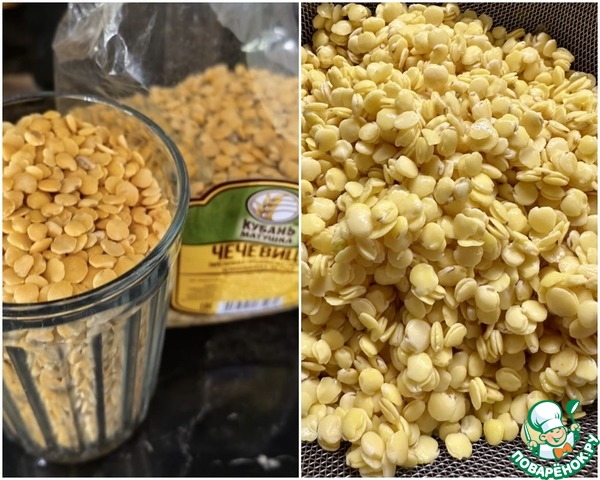 Как только бульон вариться поставил, стакан с четвертью жёлтой чечевицы я промыл очень хорошо и залил водой. Воды была температурой где-то градусов восемьдесят. И пока бульон варился, чечевица отмокала. Пока бульон сварился, пока я давление сбрасывал в агрегате, мясо вынимал, бульон процеживал – часа два точно прошло. Может чуть больше. Чечевица в объёме здорово прибавила.