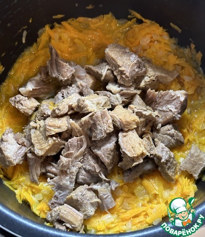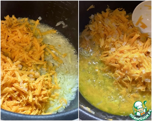 Снял с бульона жирок сверху и в чашу мультиварки его вылил. Опять режим «Жарка». Т-ра максимальная. Как зашкворчало, так сразу лук в чашу и высыпал. Дождался пока лук запрозрачневел и добавил морковку. Снизил температуру до 150 градусов и минут пятнадцать морковку с луком потушил. Помешивал постоянно.